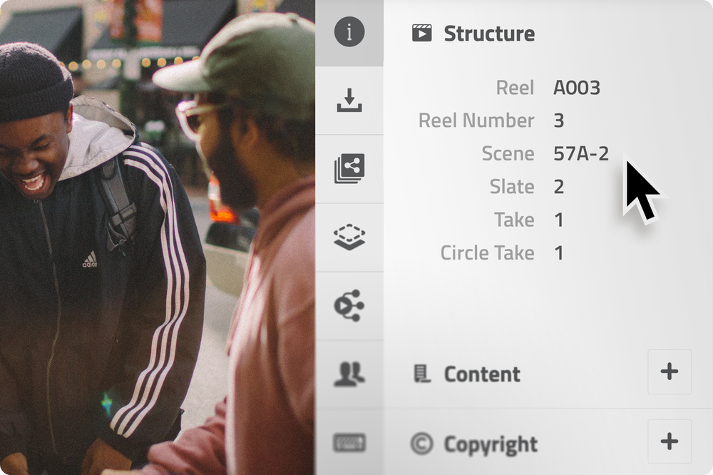 With the help of metadata, important information is stored in the files that can facilitate your entire workflow. These should be maintained and completed from the beginning to the end of your project. In addition to technical data like frame count, time code, bit rates, they can also contain content information such as reel, scene, take and QA comments. These are collected during the production by the camera, the DIT, the Script Supervisor or the Editor.
